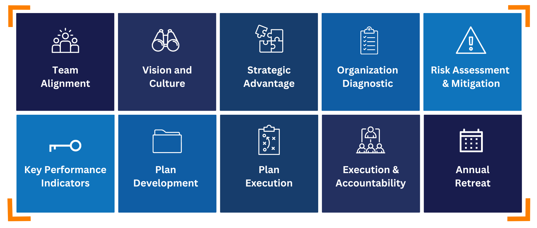 StratPro centers on a series of expertly facilitated workshops designed to align your team and help them execute. Unlike other strategic planning workshops that are one-and-done without the support needed for implementation, StratPro’s carefully crafted program provides a framework for both forward-thinking strategic planning and accountability-driven implementation.